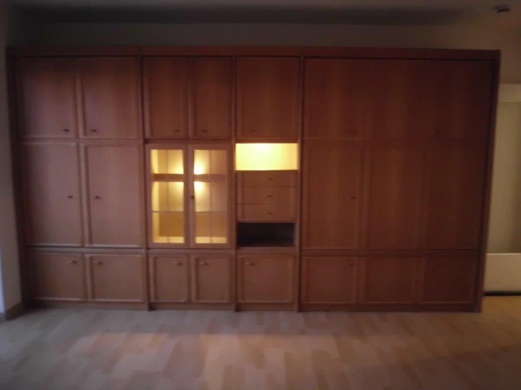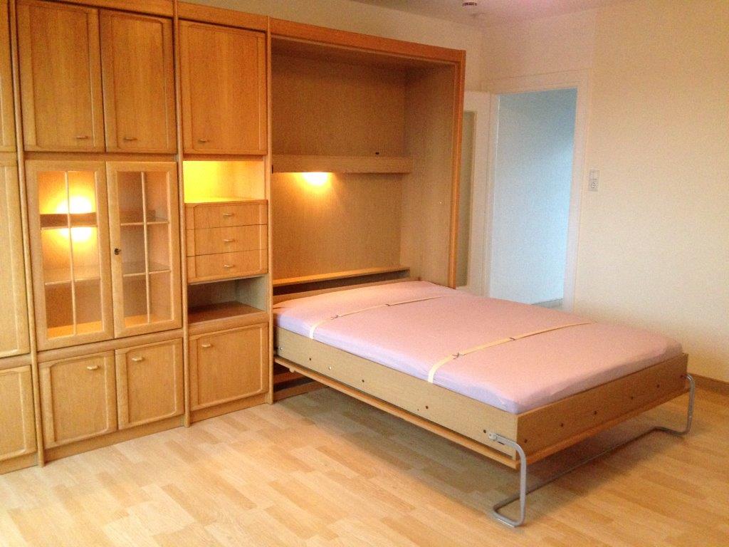 im Wohnzimmer: Schrank mit Beleuchtung und Klappbett 140 cm X 200 cm, Jalousien, Deckenleuchte, Laminat